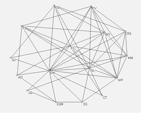 Density defines the extent to which network members are connected to each other out of all the possible connections they might have. A high degree of density in which a large number of potential ties are realised allows for greater communication and the development of and exposure to group norms: this also implies how quickly or slowly information can be expected to diffuse in the network. Most Bluestockings knew each other personally and were relatively frequently in touch with each other, so the network was very dense. This is demonstrated in Figure 1, which presents the overall network structure of the year 1760. Centrality refers to the network prominence of an individual on the basis of the number of links which connect them directly to others (see e.g. Smith 2002:138); Figure 1 shows that Elizabeth Montagu (EM) was one of the most widely connected network members. She expanded her network to include people whom she considered interesting and actively promoted those under her patronage. Other particularly central figures were Elizabeth Carter (EC) and Lord Lyttelton (GL). Donnellan, Gregory, Johnson, Scott, Talbot and Edward Montagu have been included as fringe members.