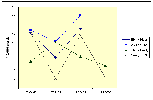 When these categories are applied to Montagu and her network contacts over time, it seems that we might be mostly looking at potential early adopters and early majority. The Bluestocking network consisted of strong ties and it was very dense, so the interaction between network members was frequent and varied. It follows that the circle was likely to have included opinion leaders whose example or verdicts were observed in new situations, and when accepted by these people, changes may have spread rapidly through the network. There may also have been persuasion to adopt group norms, and individuals were probably aware of other network members’ attitudes towards innovations. Overall, Elizabeth Montagu would not have been a radical innovator. In her youth she was probably influenced a great deal by the example of the Duchess of Portland, at least until her marriage in 1742, and perhaps also after that. Her family and her husband would also have provided her with a linguistic model. From the 1750s onwards, if we accept Rogers’s claim that earlier adopters are in general of higher status but also social risers on the move (1983:251), Elizabeth Montagu could be characterised as belonging to the category of early adopters or the early majority. As an integrated network member who already in the 1750s was a contact builder and one of the central Bluestockings, she might not have been willing to accept the risks inherent in being an innovator. The same probably also applies to other central Bluestockings. It does not seem probable that this tight-knit group of fairly conservative gentry people would have led the first wave of linguistic innovations. Raumolin-Brunberg (2006) shows that during the late fifteenth and sixteenth centuries linguistic innovations originated in the lower social classes, whereas the leaders of the second phase of change mostly represented the influential upper classes of London and the court. It is overall more probable that the Bluestockings acted as the network’s early adopters and opinion leaders, or as early majority. Early adopters have also shown to have more sources of external influence (Valente 1996:74), which fits well with the overall activities of the Bluestockings. Considering the social structure of the group, the aristocrats, most of whom were men and had received a classical education, may have been considered as opinion leaders. Despite her central position in the network, Montagu’s gender and the social implications and restrictions it entailed may have caused her to be more hesitant than early adopters and early majority in reacting to innovations, and more inclined to look at the example of her peers and superiors.